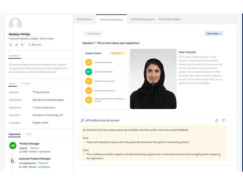 “أنصح به بشدة لأي شخص يبحث عن حلول مبتكرة للتوظيف. ومن الرائع أيضاً أن يكون لدينا أداة مثل هذه لتحسين مهاراتنا في المقابلات. أتذكر عندما كنت أصغر سناً، كان سيكون من المفيد للغاية وجود أداة مثل هذه للتحضير بشكل جيد لمقابلاتي؛ كان سيكون لها تأثير كبير على نجاحي.”