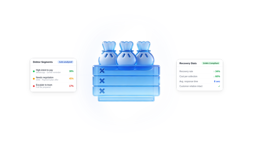 استرد المديونيات بذكاء تحصيل أعلى، تكلفة أقل، علاقة عميل محفوظة متوافق مع SAMA
